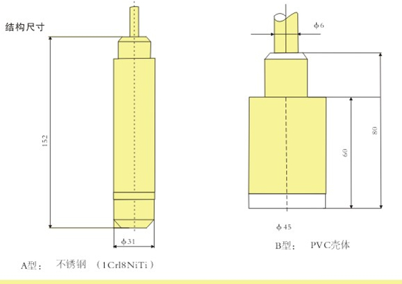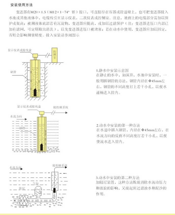 PT311型投入式液位變送器(也稱靜壓式液位變送器)選用進口帶防腐膜片敏感組件,將芯片裝入一個不銹鋼(或PVC)殼體內,頂部的鋼帽起保護傳感器膜片的作用,同時使液體流暢地接觸到膜片。該產品用特制的防水中空電纜使感壓膜片的背壓腔與大氣良好相通,測量液位不受外界大氣壓變化的影響,測量準確,長期穩(wěn)定性好,并具有優(yōu)良的密封及防腐性能,可直接投入水、油等液體中長期使用。PVC材料的外殼及電纜可測量多種防腐蝕性液體。