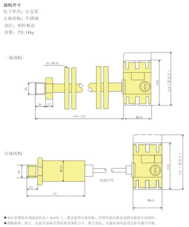 LY421型中高溫壓力變送器采用進(jìn)口耐高溫敏感元件組裝,傳感器探頭能在350℃高溫下長(zhǎng)期穩(wěn)定工作。芯體與不銹鋼外殼之間采用激光冷焊工藝,使其完全熔為一體,確保了變送器在高溫狀態(tài)下的使用安全。傳感器的壓力芯片體與放大電器之間,用聚四氟乙烯墊片隔熱,并加有散熱裝置,內(nèi)部引線孔填充高效隔熱材料硅酸鋁,有效地防止了熱傳導(dǎo),保證放大轉(zhuǎn)換電路部分在允許溫度下工作。